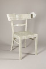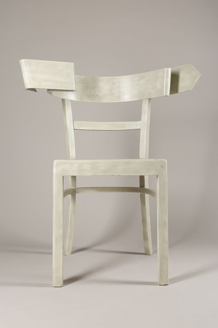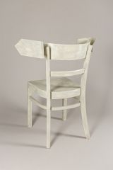 Ein gewöhnlicher Stuhl wird hier durch eine einzige, entscheidende Veränderung – eine zur Pfeilform geschwungene Rückenlehne – zum Sinnbild für Bewegung, Orientierung und Richtungsgebung. Hofer spielt mit der Erwartung des Betrachters: Der Stuhl, Inbegriff von Ruhe und Stabilität, weist nun selbst eine Richtung, er 'zeigt', anstatt nur zu 'tragen'. So entsteht ein poetischer Widerspruch zwischen Funktion und Bedeutung, zwischen Stillstand und Dynamik. Mit feinem Gespür für Form und Ironie setzt Hofer auch hier seine charakteristische Strategie fort, Alltagsobjekte durch minimale Eingriffe in intelligente, konzeptuell dichte Skulpturen zu verwandeln.
