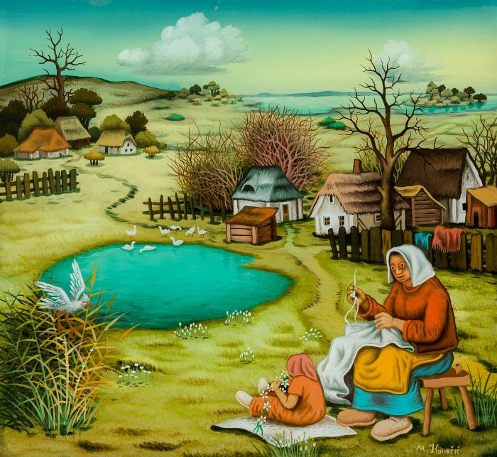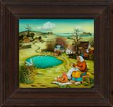 Lot Nr: 143 - Frau beim Nähen mit Kind am Teich